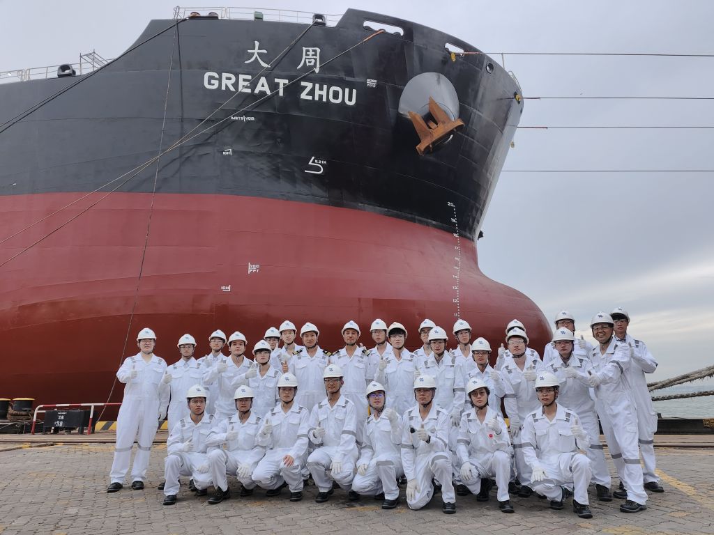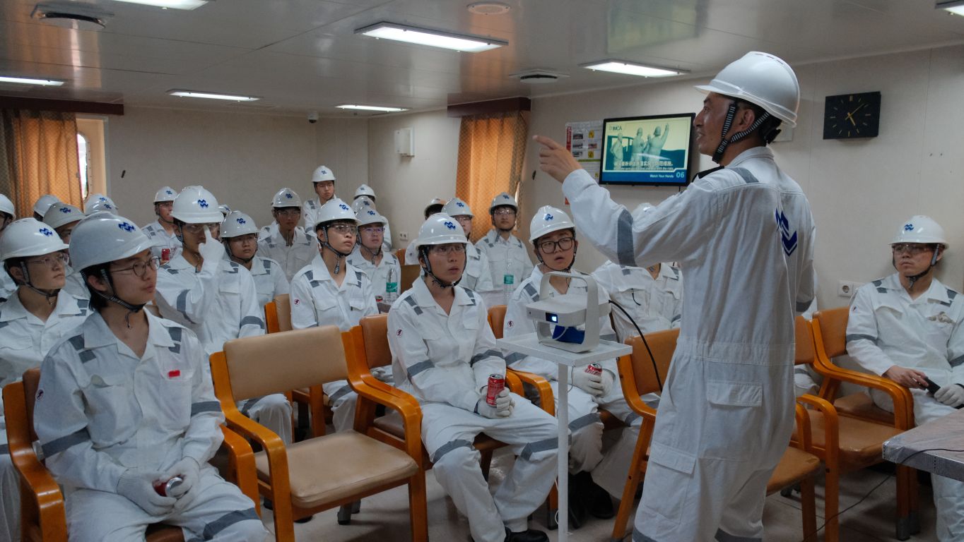 登轮前,“大周轮”船长王慧勇对师生们到来表示热烈欢迎,介绍了船舶基本情况及船上工作分工。船厂安全员对师生们进行安全教育,详细讲解登轮安全及保密注意事项,为参观筑牢安全防线。师生们有序换装并穿戴个人防护装备(PPE)后分组登轮,前往驾驶台、机舱和生活区学习体验,实地了解船舶关键部位、运行原理与船员生活环境。